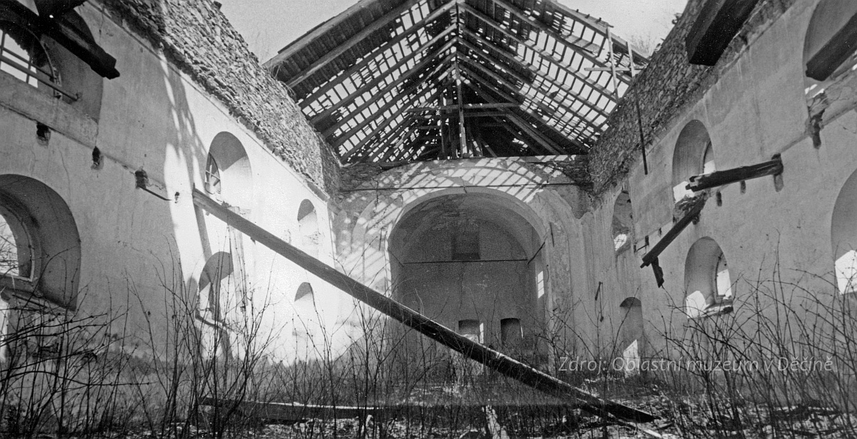 Interiér kostela před zborcením většiny krovu