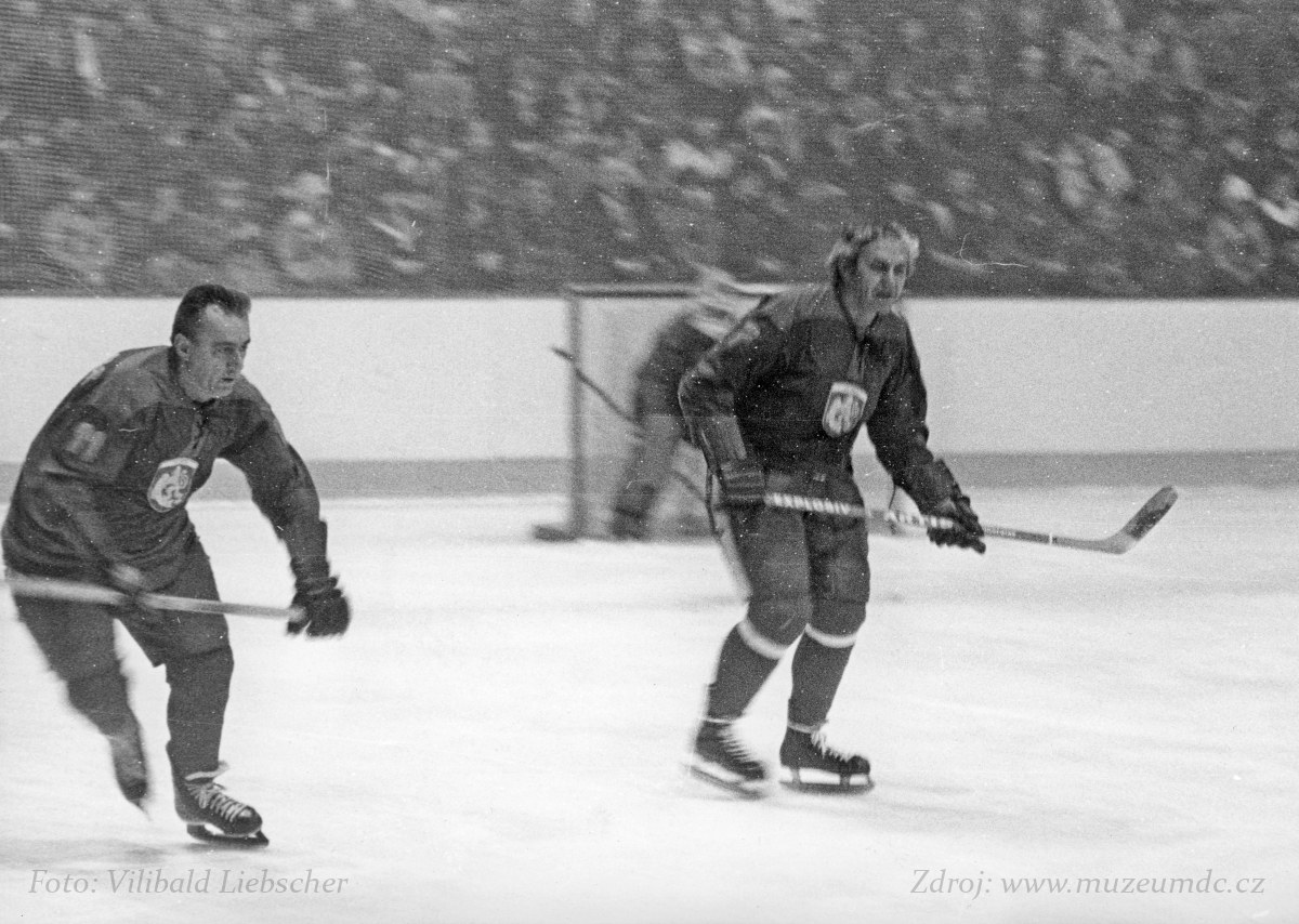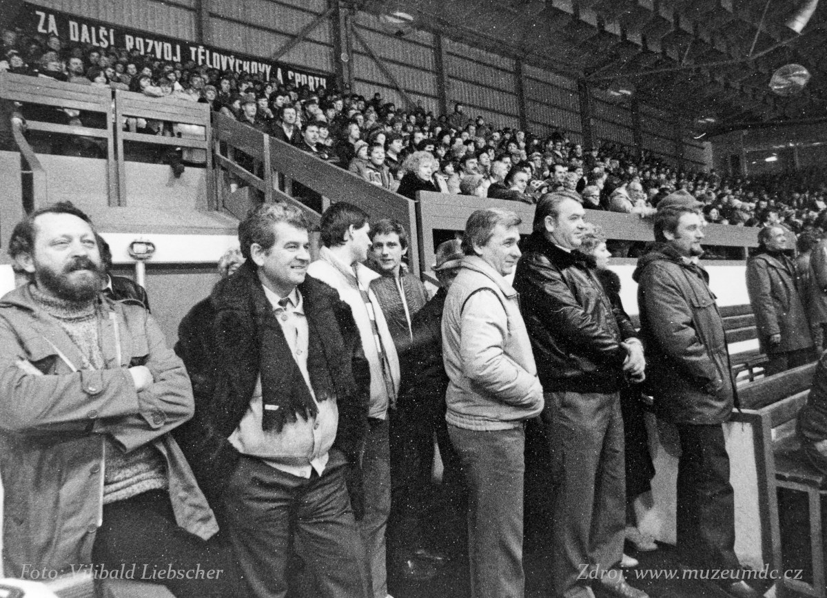 První zleva Jiří Zahajský, který jako správný Děčíňák přišel fandit. Třetí zleva hokejista Josef Kubeš.