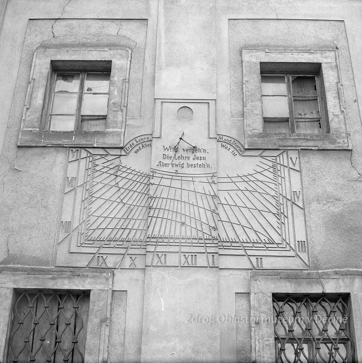 Sluneční hodiny po opravě fasády. Německý nápis v překladu znamená: „Země, slunce, měsíc, hvězdy a všechno, co je, pomine, Ježíšovo učení však přetrvá věčně.“