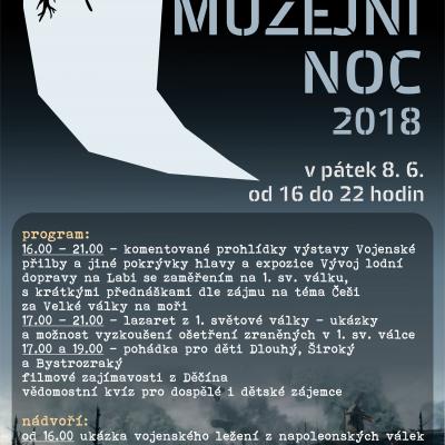 Vše začíná v 16 hodin komentovanými prohlídkami výstav Vojenské přilby a jiné pokrývky hlavy a Vývojem lodní dopravy na Labi se zaměřením na 1. světovou válku, dále krátké přednášky dle zájmu na téma Češi za Velké války na moři. Prohlídky se budou konat do 21 hodin, dle Vašeho zájmu.
