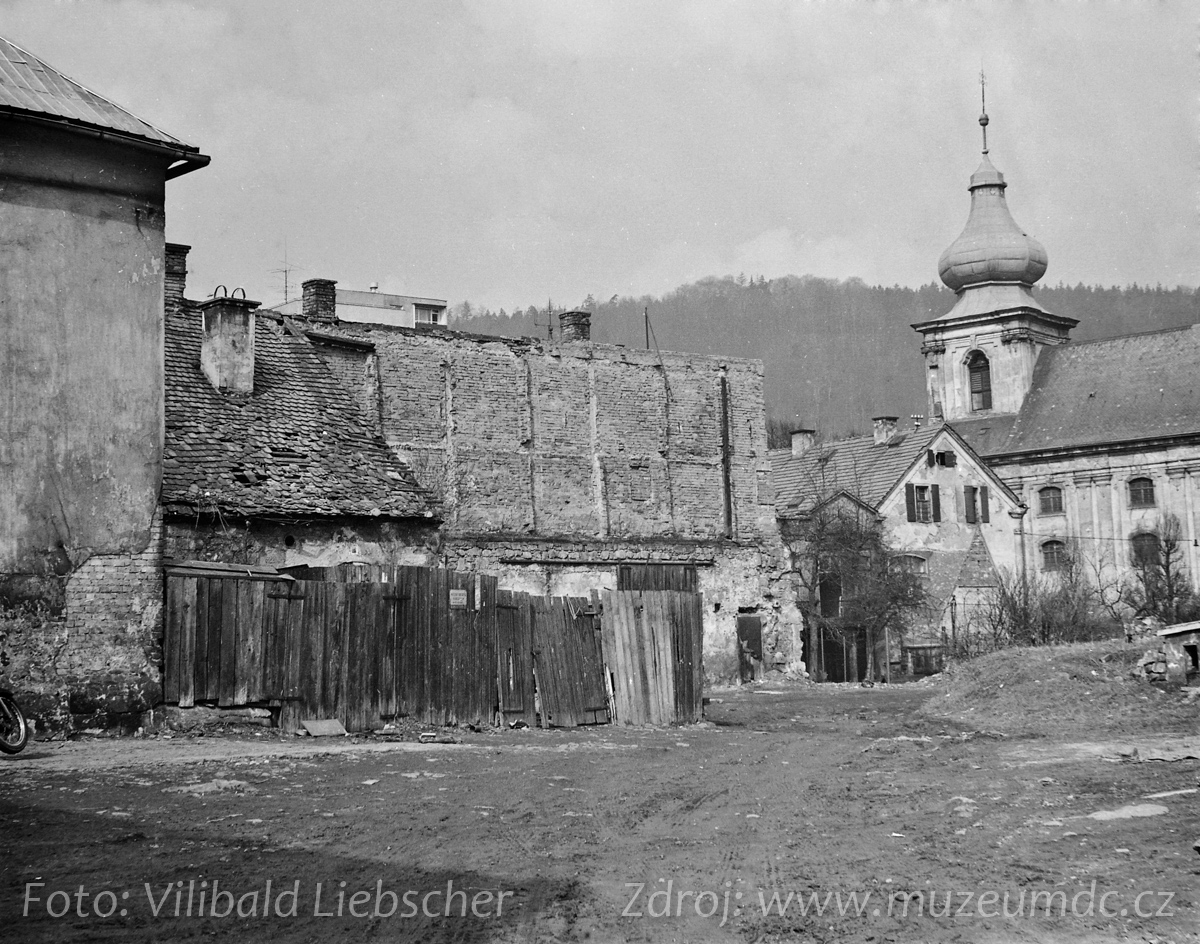 Na snímku je mimo jiné vidět dvůr, kde probíhalo zásobování dvou prodejen – řeznictví a ovoce-zeleniny (obě byly ve stejném domě v levém horním rohu náměstí)
