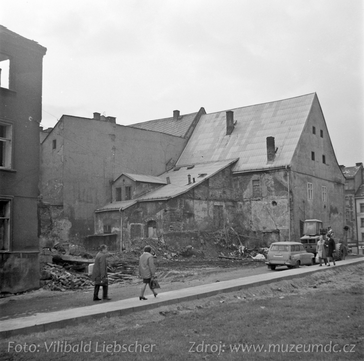 Pohled z Masarykova (tehdy Leninova) náměstí do Hrnčířské ulice. Je dobře vidět její původní podoba. Vzadu dům čp. 330/20 v Pohraniční ulici, který ze všech domů, které jsou na snímku, jediný dodnes stojí.