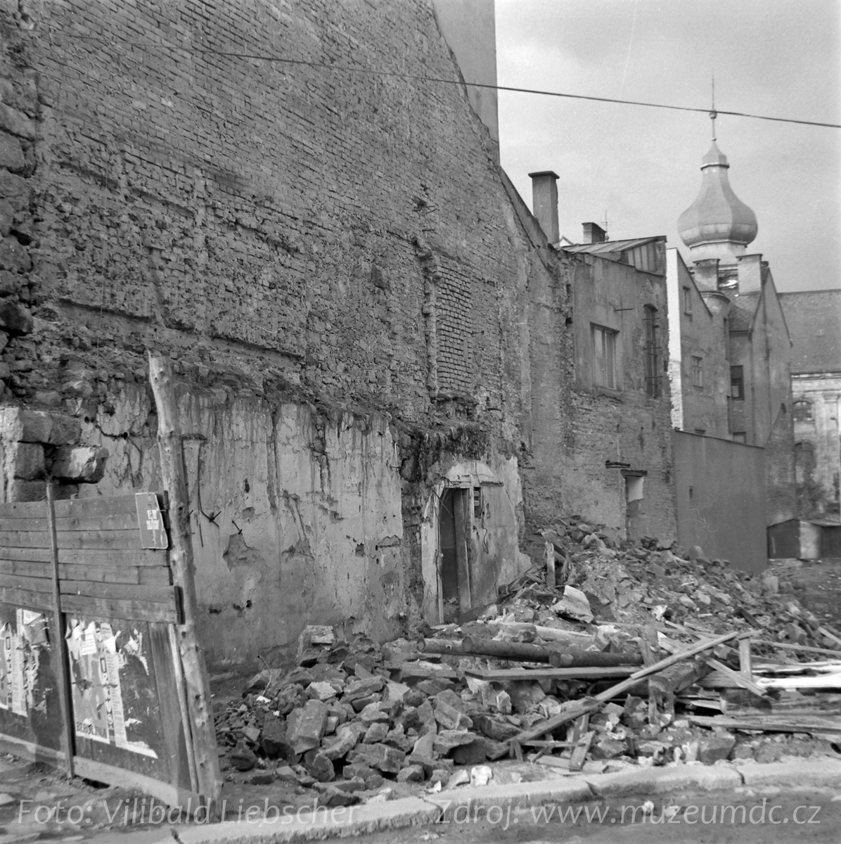 Křižovatka Hrnčířské a Pohraniční ulice. Hrnčířská vlevo, Pohraniční vpravo. Domy v Pohraniční ulici byly zbourány také. (Pohraniční ulice se tehdy jmenovala Pohraniční stráže.)