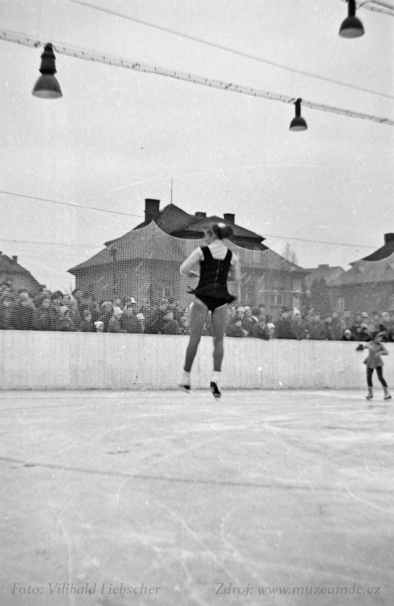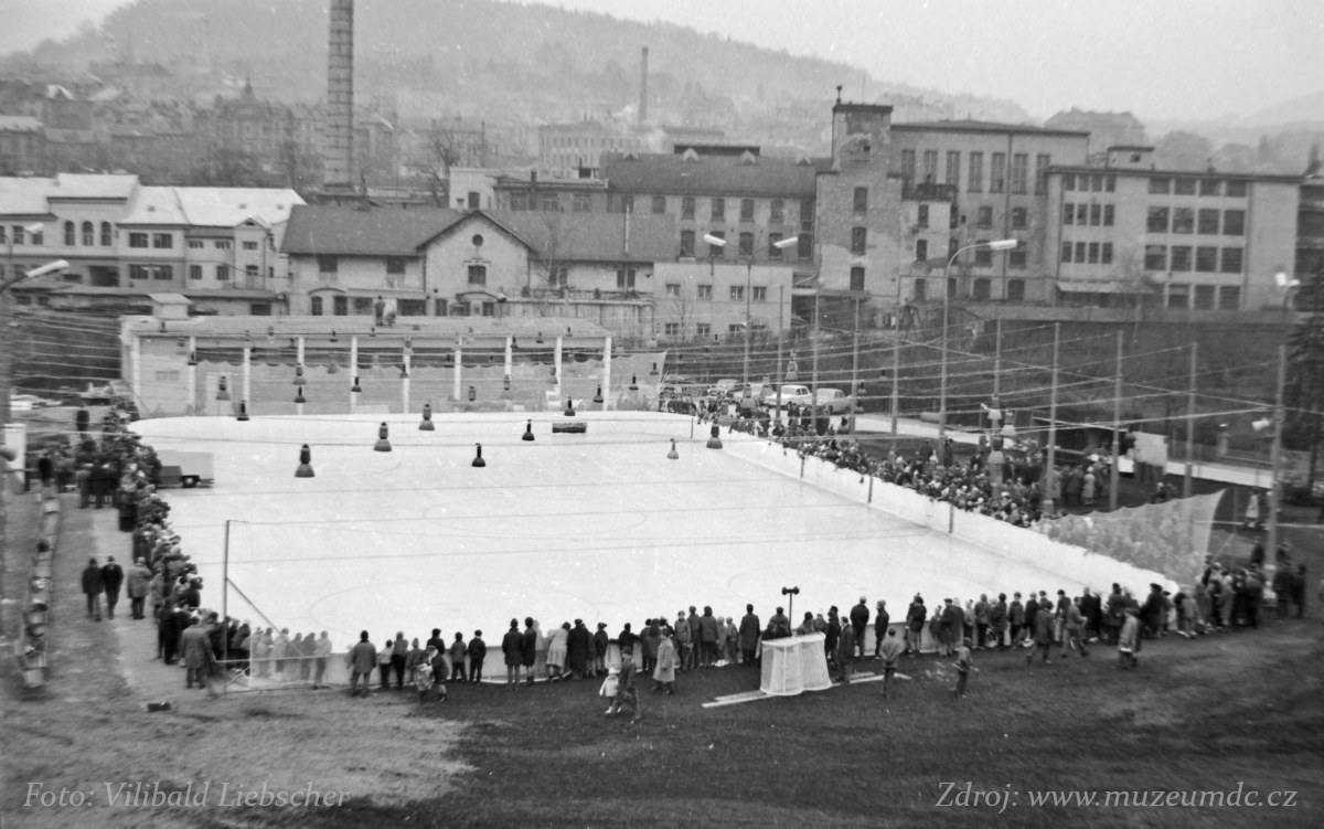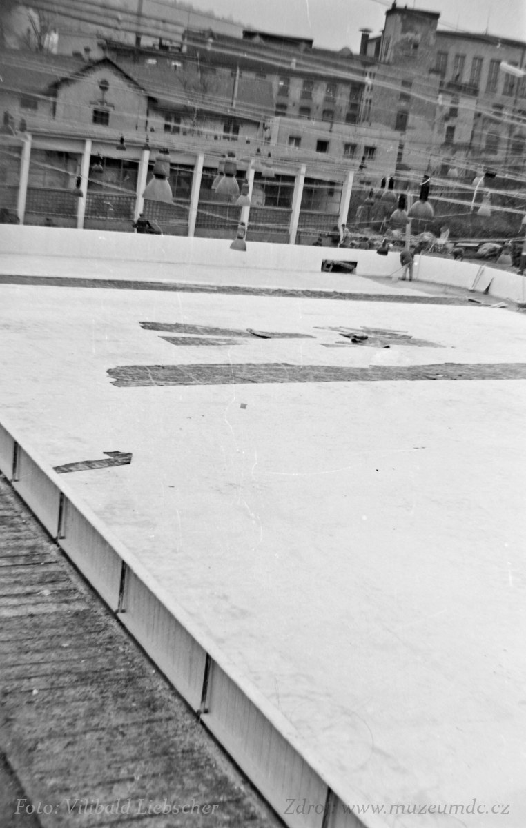 Stavba otevřeného (nekrytého) zimního stadionu a jeho slavnostní otevření, ulice Ve Vilách, Děčín I, 1969