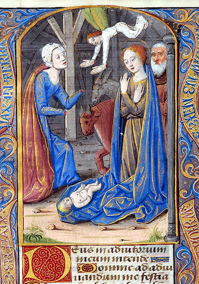 Narození Páně, Salome přišla o ruce, kniha hodinek (MS M.7 fol. 14r), Francie, 1490–1500 (The Morgan Library & Museum, New York)