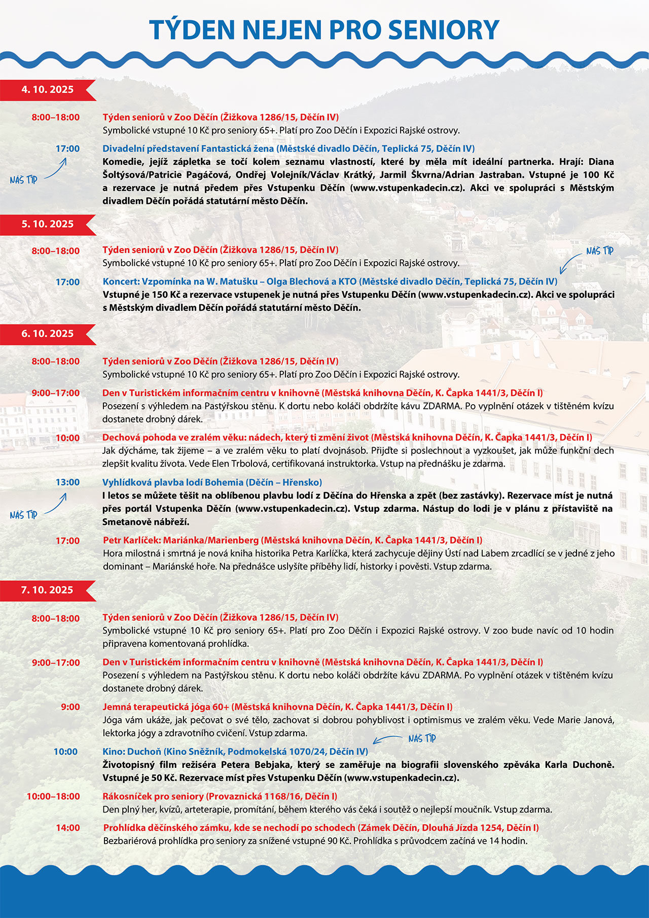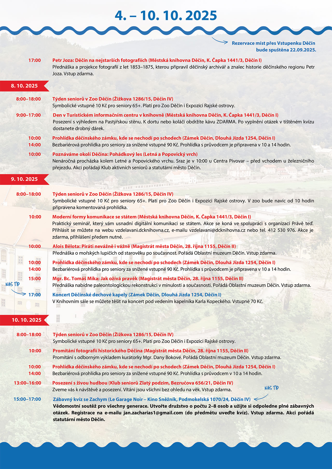 Týden nejen pro seniory 4. – 10. října 2025 ssir čt 02. 10. 2025 - 08:06 přílohy Týden nejen pro seniory 2025 – program (pdf) Od 4. do 10. října 2025 se koná Týden nejen pro seniory. Přednášky zaměstnanců Oblastního muzea v Děčíně probíhají na Magistrátu města Děčín, 28. října 1155/5, Děčín I. Podrobnosti v programu: